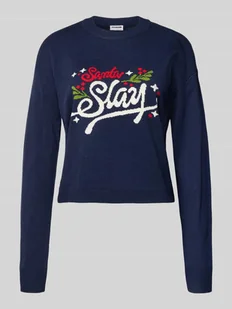Sweter z dzianiny damski Noisy May;Luźny krój;Prążkowane wykończenia;Model ‘CLAUS’;Okrągły dekolt;Nadruk ze sloganem;Długość tyłu w rozmiarze S: 49 cm;Długość rękawa w rozmiarze S: 54 cm
