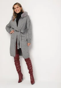 Szary Kardigan z Wełną o Prostym Kroju z Kapturem z Odpinanym Futrem Wiązany w Pasie Besigala