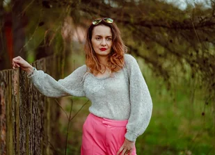 Sweter robiony na drutach z wyjątkowo miękkiej, przyjemnej i niegryzącej włóczki z włoskiem. Duży dekolt i szersze rękawy podkreślają kobiecość. Z lewej strony wyszyłam kwiaty, które jak oszronione połyskują sre ...