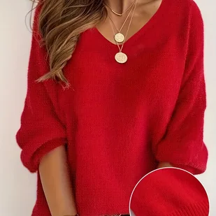TEMU 1 szt. Elegancki dzianinowy sweter z wyciętą dekolacją w kształcie litery V dla kobiet, poliestrowy, jednokolorowy, nadrukowany, wiosna/jesień,