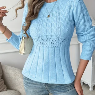 TEMU 1 szt. Elegancki polarowy sweter z długim rękawem dla kobiet - 100% poliestrowy pulower z okrągłym dekoltem i detalem z dzianiny, jednokolorowy,