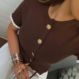 TEMU Bluzka Damska - Elegancka z Falbanką i Detalami na Guziki, Miękka z Krótkim Rękawem i Okrągłym Dekoltem, Jednokolorowa na Wiosnę, i Jesień,
