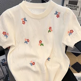 TEMU Elegancka bluzka z krótkim rękawem, haftowana w kwiaty, z okrągłym dekoltem, idealna na . Charakteryzuje się średnią elastycznością i regularnym