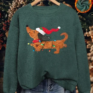 TEMU Ciepły sweter damski na Boże Narodzenie Świąteczny kreskówkowy pies kiełbaskowy w kapeluszu Świętego Mikołaja i kolorowe światełka, okrągły