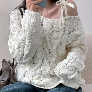 TEMU Damska bluzka z długim rękawem na sznurówkę z odkrytymi ramionami, z francuską, słodką i młodzieżową, retro konstrukcją kabli, luźny i