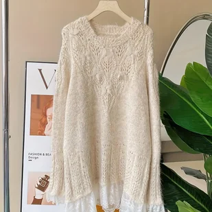 TEMU Sweter Y2K dla Kobiet - Luźny Krój z Długim Rękawem, Okrągły Dekolt i Prześwitujące Detale Koronkowe, Kolorowy, Tylko Pranie Ręczne, Casualowa