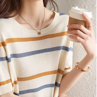 TEMU Damski casualowy, paskowany, krótki rękaw, pulower - Beżowy, niebieski i brązowy kolorowy blok, okrągły dekolt, top na każdą porę roku, wygodny