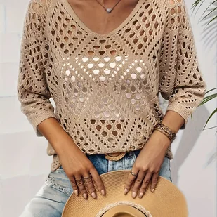 TEMU Sweter Damski Elegancki - Beżowy Półprześwitujący Sweter do Biura, na Imprezę i Codzienność - Sweter z Długim Rękawem o Średniej Elastyczności -