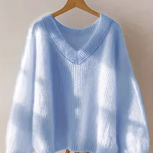 TEMU Unikalny, swobodny sweter w jednolitym kolorze z dekoltem w serek na jesień i zimę, miękki i przytulny, luźny i uroczy, idealny do łączenia z