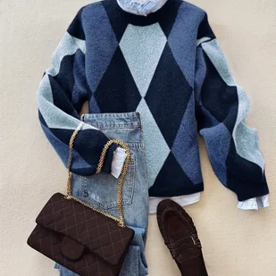TEMU Damski Miękki Sweter - Niebieski/Biały/Czarny/Brązowy Wzór w Kratę, Blok Kolorystyczny, Okrągły Dekolt, Długi Rękaw, Ciepły Sweter na Zimę,