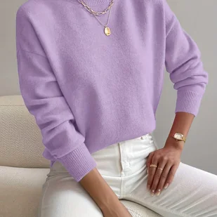 TEMU Damski Miękki Sweter w Kolorze Lawendy z Dekoltem - Jednokolorowy, Ciepły Sweter na Zimę z Długim Rękawem i Białymi Lamówkami, Casualowy i