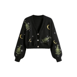 TEMU Damski, przytulny czarny kardigan z świątecznym motywem choinki i księżyca - długi rękaw, zapinany na guziki, moda jesień/, styl casual,