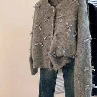 TEMU Nowy letni i zimowy sweter damski z szarym kokardą, w luźnym stylu kardigan.