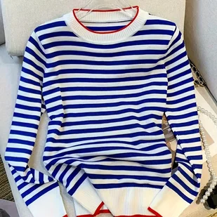 TEMU Damski sweter casualowy w paski - długi rękaw, okrągły dekolt, wysoka rozciągliwość, design w b kolorów, białe i niebieskie paski w pionie,