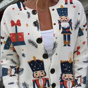 TEMU Damski Sweter-Kurtka z Nadrukiem Żołnierza Dziadka do Orzechów i Prezentów Świątecznych – Przytulna Kurtka na Zimę, Długi Rękaw, Okrągły Dekolt,