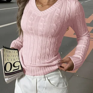 TEMU Damski Sweter V-Neck z Warkoczem, Dopasowany, Idealny na Jesień i Zimę – Miękki, Ciepły z Długim Rękawem, Elegancki i Casualowy Sweter
