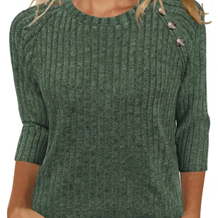 TEMU Damski Sweter w Kolorze Oliwkowym z Rękawem 3/4 - Casualowa Bluzka na Guziki o Zaokrąglonym Dekolcie, Lekki Top Warstwowy Na Każdą Porę Roczną,