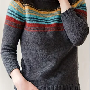 TEMU Damski sweter w paski z blokami kolorów - długi rękaw, okrągły dekolt, szary z żywym żółtym, niebieskim, czerwonym i zielonym paskiem poziomym,