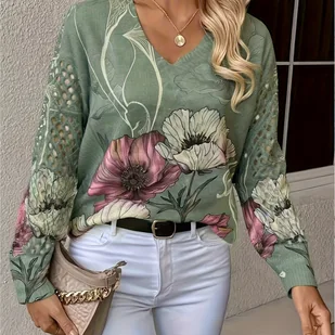 TEMU Damski sweter we wzór lotosu - elegancki sweter z dekoltem w serek w zielony druk, wykonany z miękkiej tkaniny, idealny na jesień i zimę,