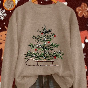 TEMU Damski sweter z nadrukiem choinki - Przytulny brązowy pulower z czerwonymi i zielonymi ozdobami, bluzka z długim rękawem i okrągłym dekoltem na