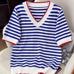TEMU Damski swobodny top z dekoltem w kształcie litery V - Letni 2025 koszulka z krótkim rękawem w paski w niebiesko-białych odcieniach, miękki