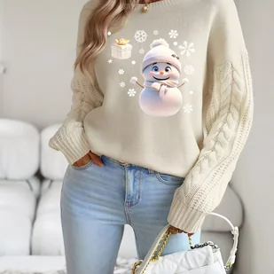 TEMU Damski, wygodny sweter beżowy z świątecznym nadrukiem - Długi rękaw, okrągły dekolt, prążkowana tekstura, idealny na jesień i zimę, styl casual,