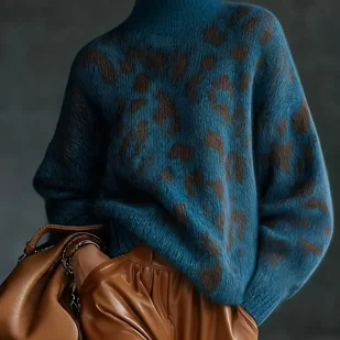 TEMU Elegancki Sweter Damski w Czarno-Biały Wzór Lamparczy - Z Golfem i Opadającym Ramieniem, Długim Rękawem na Jesień i Zimę, Przytulny Pulower z