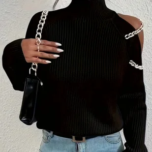 TEMU Damski Zimowy Ciepły Sweter z Odkrytymi Ramionami i Wysokim Kołnierzem – Luźny Fason z Rozciętymi Rękawami, Jednokolorowa Bluzka, Ręcznie Prany