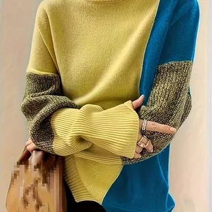TEMU Damski Luźny Sweter z Blokami Kolorów, Miękki Pulower, Wysoki Kołnierz, Styl Damski