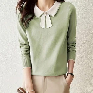 TEMU długa koszulka z kolorowymi elementami i kokardką na jesień i zimę 2024 roku dla kobiet, swobodny i uniwersalny dzianinowy top, damski sweter.