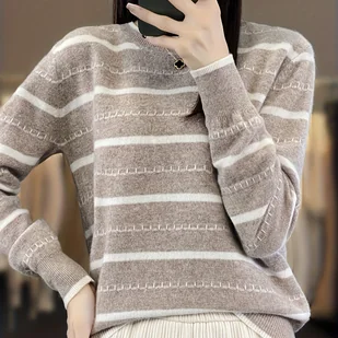 TEMU Elegancka Bluzka Sweterowa Damska w Paski z Okrągłym Dekoltem - Miękka, Regularna Długość, Sweter z Paskami i Kolorowymi Wstawkami, Średnio
