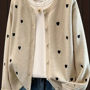 TEMU Elegancka Damska Marynarka Sweter z Ręcznie Haftowanym Sercem na Kołnierzu – Ciepły Zimowy Kardigan z Kołnierzem, Pranie Ręczne, Okrągły Dekolt,