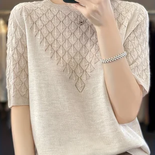TEMU Elegancka koszulka z okrągłym dekoltem i krótkim rękawem, z węzłem, jednokolorowa, z wąską, z drążką, dla kobiet