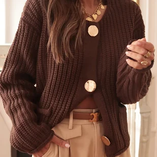TEMU Brązowy, luźny kardigan damski z okrągłym dekoltem i dużymi złotymi guzikami. Stylowy i uniwersalny, idealny do eleganckiej zimowej garderoby,