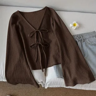 TEMU Elegancki damski kardigan z dekoltem w serek i długim rękawem, falbanką i wiązaniem z przodu - luźny krój, jednolity brąz, całoroczny element