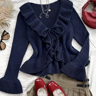 TEMU Elegancki damski kardigan z dekoltem w serek - miękki sweter z otwartą przodem, falbankami na rękawach, jednolity , uniwersalny element do