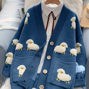 TEMU Damski luźny sweter kardigan na jesień i zimę, stylowy i modny na rok 2025, z motywem leśnym i długimi rękawami.