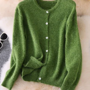 TEMU Elegancki damski kardigan z długim rękawem - Miękki zielony sweter zapinany na guziki, luźny krój, idealny na biuro i imprezę, na jesień/zimę,