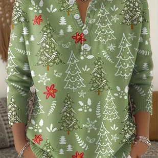 TEMU Elegancki damski kardigan z nadrukiem choinki - miękki, oddychający sweter z czerwono-zielonym świątecznym wzorem, bluzka z okrągłym dekoltem i