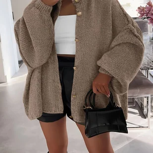 TEMU Damska Kardiganowa Bluza z Wysokim Kołnierzem, Oversize, Opadające Ramiona, Elegancka Moda na Jesień i Zimę