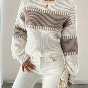 TEMU Elegancki damski sweter w biało-brązowe paski - miękki, elastyczny pulower z okrągłym dekoltem, długimi rękawami i blokami kolorów, idealny na