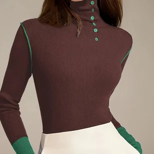 TEMU Nowy jesienno-zimowy damski sweter z długim rękawem i wysokim dekoltem w blokach kolorów, uniwersalny prążkowany top, który podkreśla sylwetkę i