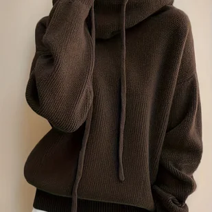 TEMU Elegancki damski sweter z kapturem w oliwkowej kolorze - miękki, elastyczny sweter z długim rękawem i kapturem ze sznurkiem, luźny krój, ciepły