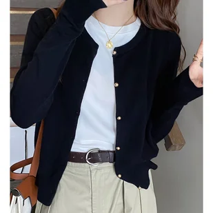 TEMU Elegancki Kardigan Damski - Miękki Beżowy Sweter z Okrągłym Dekoltem, Zapinany na Guziki z Kołnierzem i Złotymi Guzikami, Lekka Kurtka