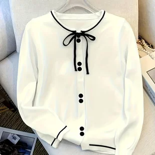 TEMU Elegancki kardigan damski z kokardą - miękki, uniwersalny sweter z okrągłym dekoltem i detalem prążkowanym, idealny na codziennie lub stylowe