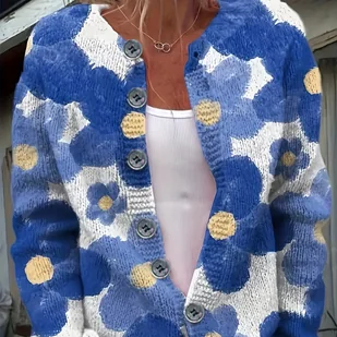 TEMU Elegancki kardigan damski z nadrukiem kwiatowym i żółtą koronką - Błękitno-biała wzór, długi rękaw, zapinany na guziki sweter na wiosnę/jesień,
