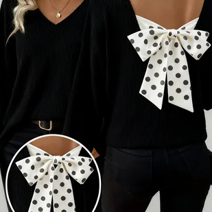 TEMU Elegancki sweter damska | Europejska i amerykańska moda Dekolt w serek Tylne okrągłe kropki Kokarda Ozdoba Damska Koszulka z długim rękawem