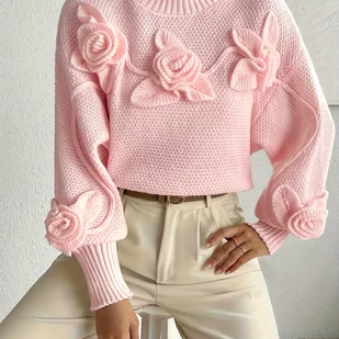 TEMU Elegancki Sweter Damski na Zimę – Miękki Różowy z Wysokim Kołnierzem i Kwiatowym Patchworkiem, Średnio Elastyczny, Odzież na Jesień/Zimę do