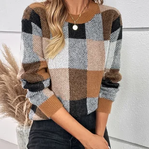 TEMU Elegancki sweter damski w kratę, jesień/, długi rękaw, okrągły dekolt, casualowy wzór w kratę, poliester, regularny krój, bez paska, bez