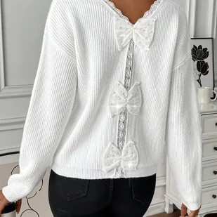 TEMU Elegancki sweter damski z dekoltem w szpic, długim rękawem, dzianiną w jednolitym kolorze i kokardką z tyłu, całoroczny sweter z koronkową